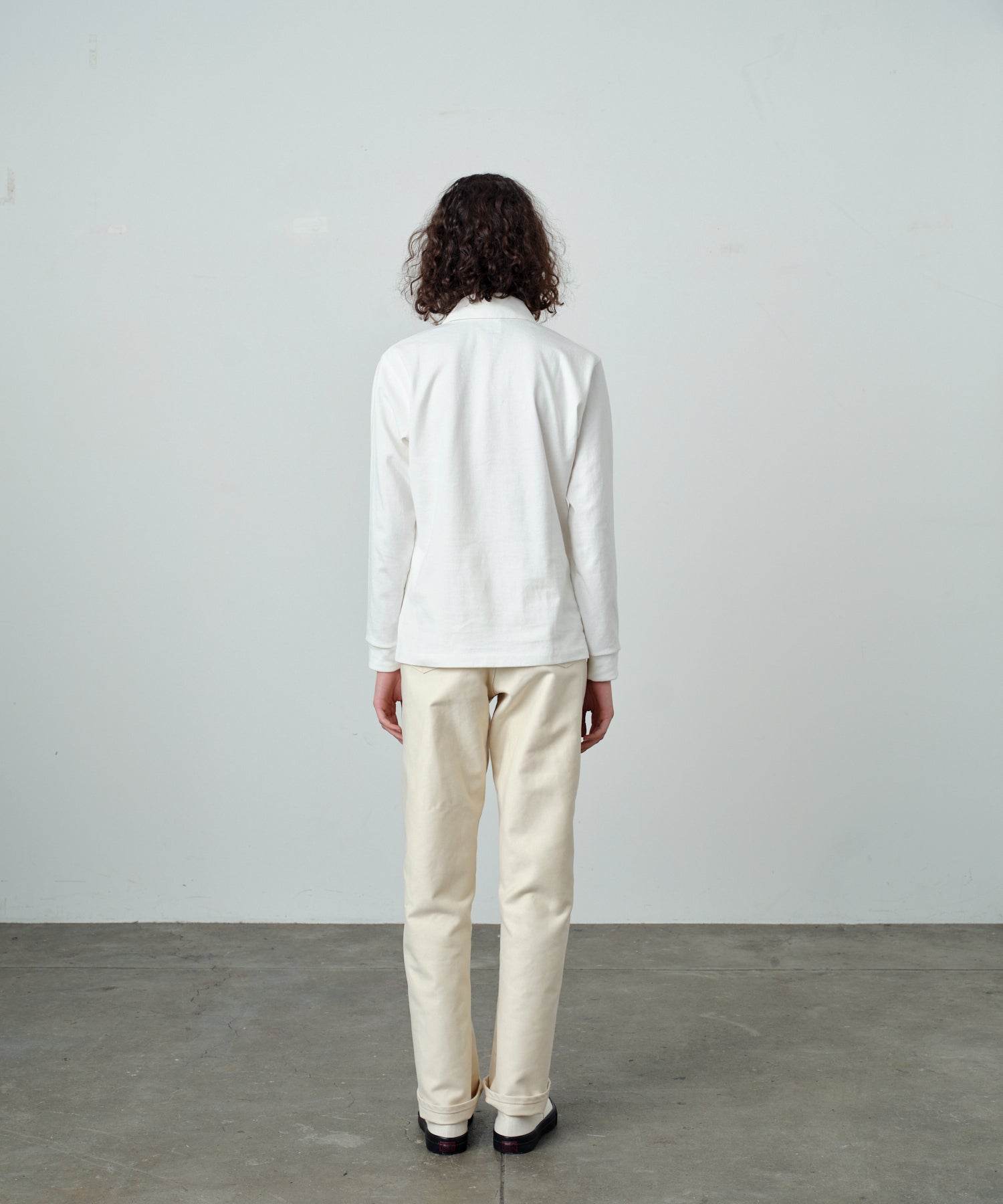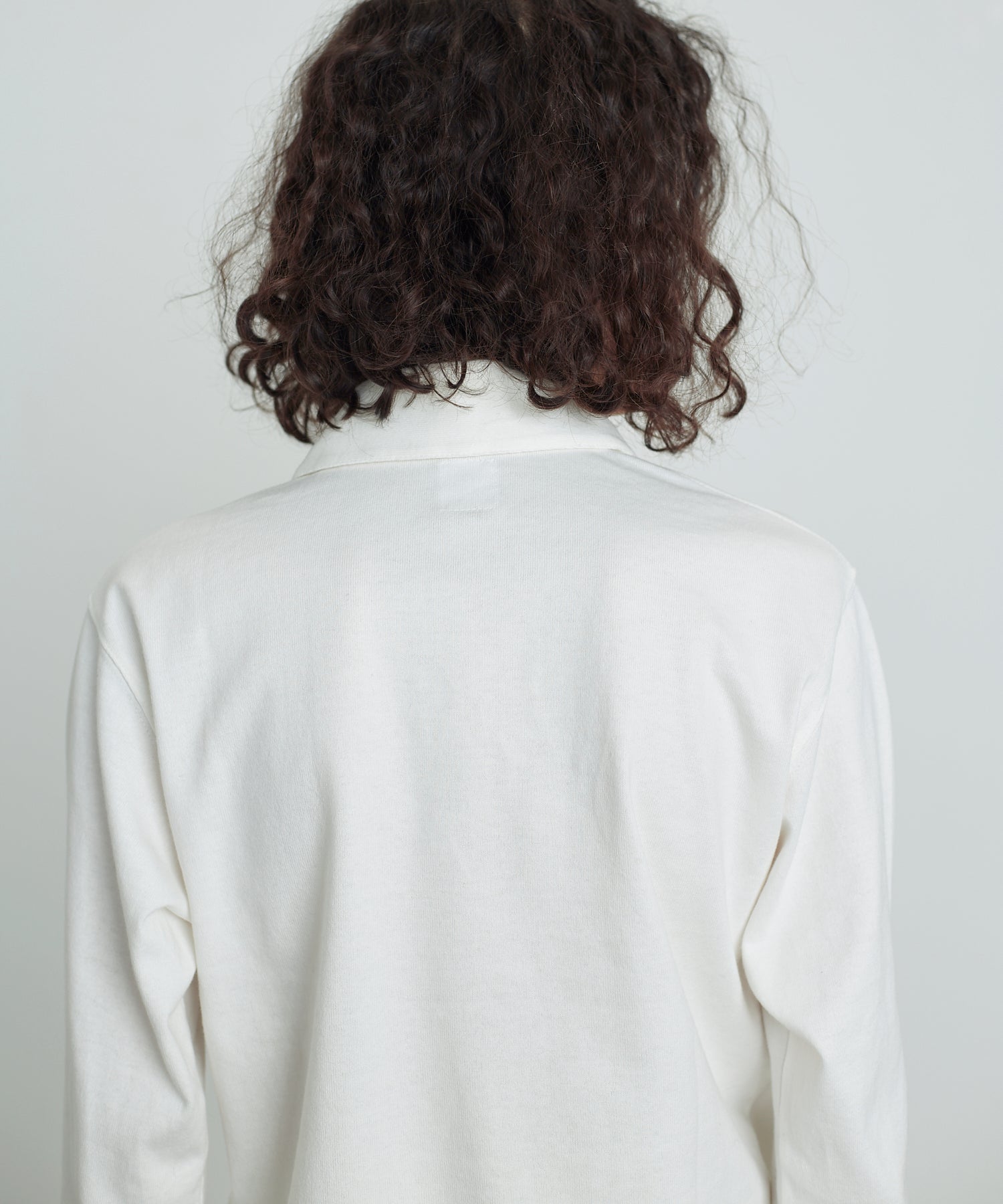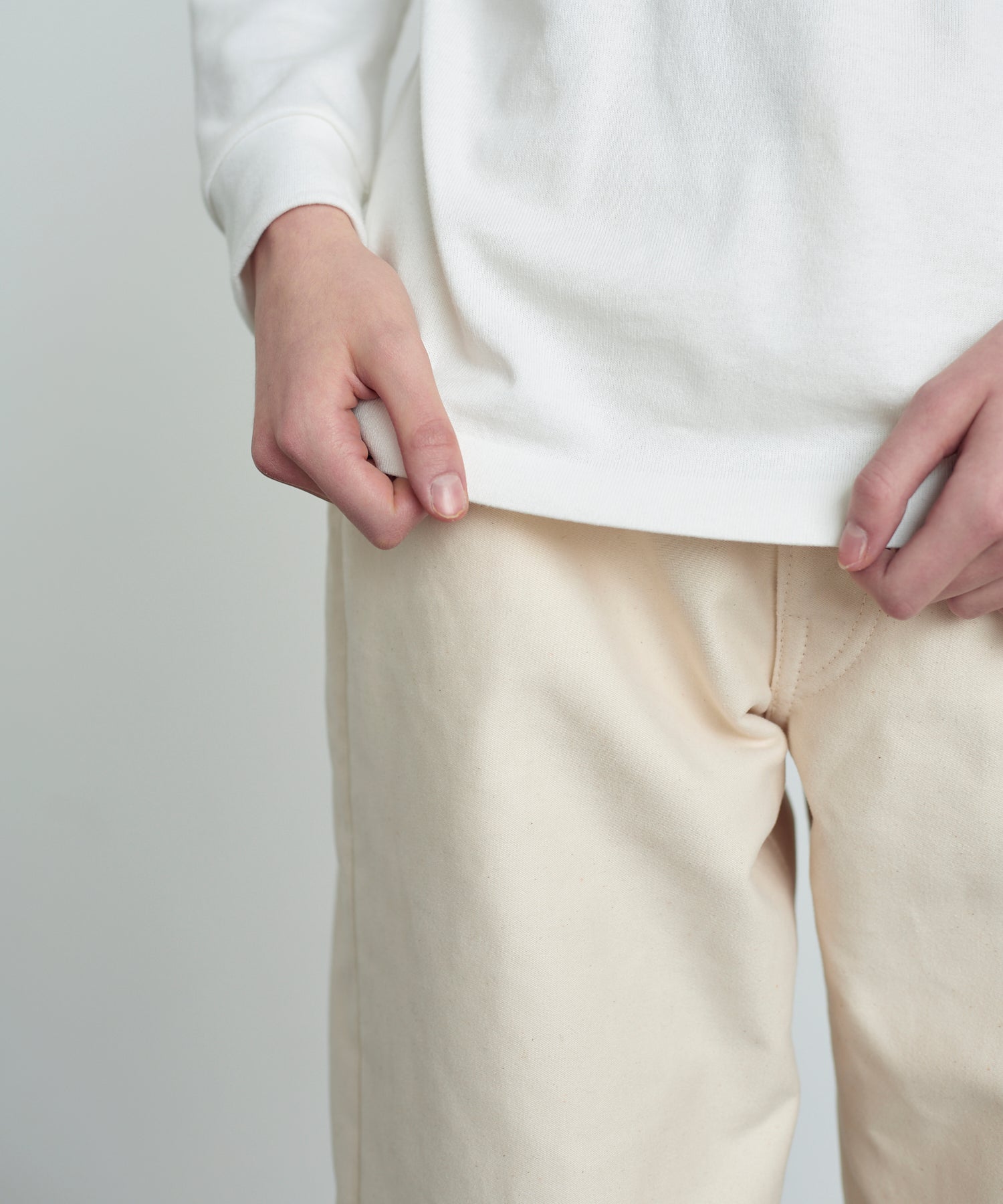 원단에는 쌀면을 원료로 공기의 힘으로 방적된 빈 방사 (오픈 엔드 얀)를 사용한 천축을 채용. 자연스러운 얼룩감과 통통한 드라이한 질감이 특징으로, 입을 정도로 피부에 친숙한 감촉이 매력입니다.