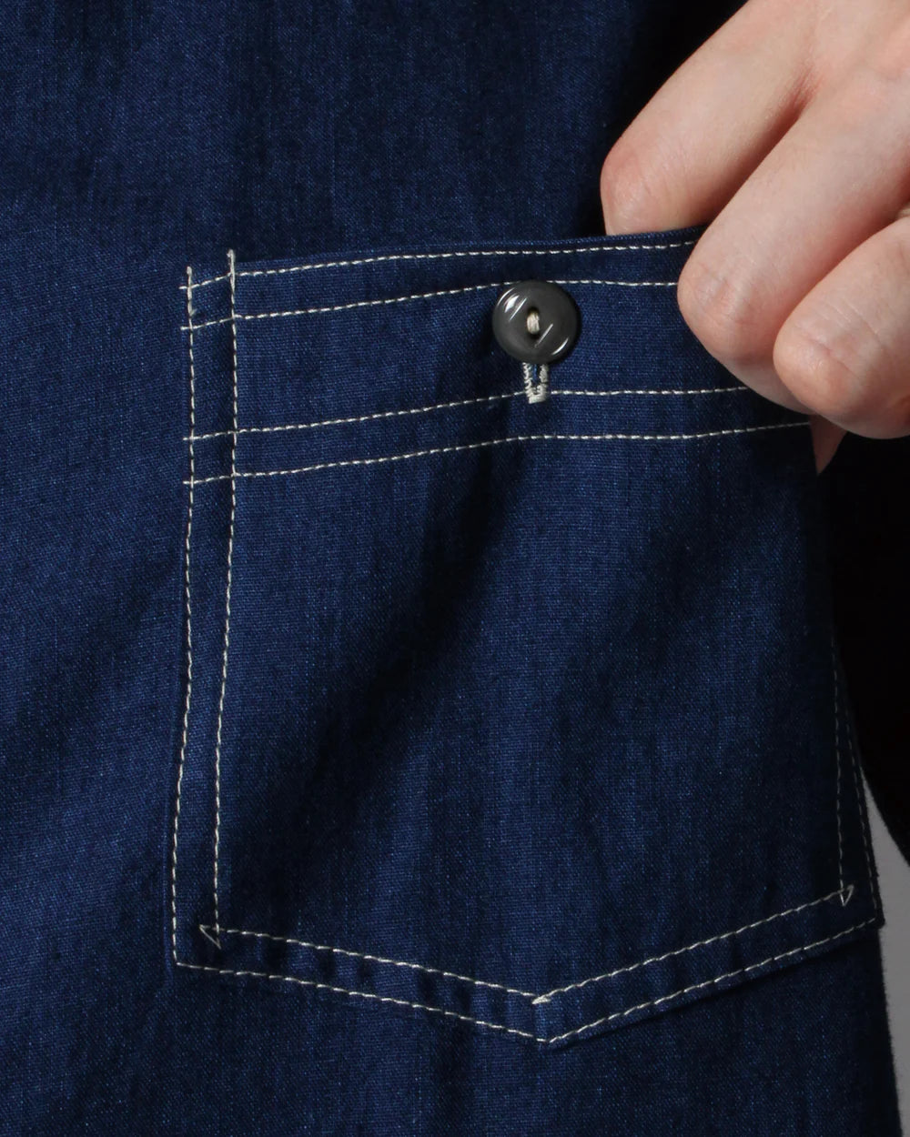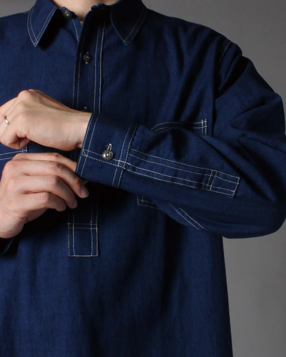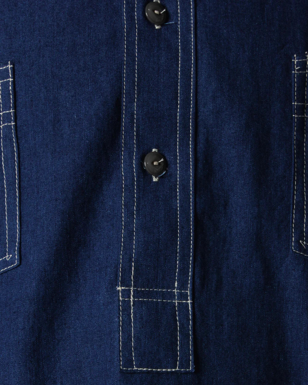 シルエットは、身幅にゆとりを持たせたクラシックなプルオーバー型。頭から被る構造や、広がりのある身頃は、当時の生活や作業環境に根差した設計そのものです。首元には「チンストラップ」を採用し、ボタンで留めることで風や埃の侵入を防ぐディテールを再現。時代背景に即した合理的な意匠が、そのまま息づいています。