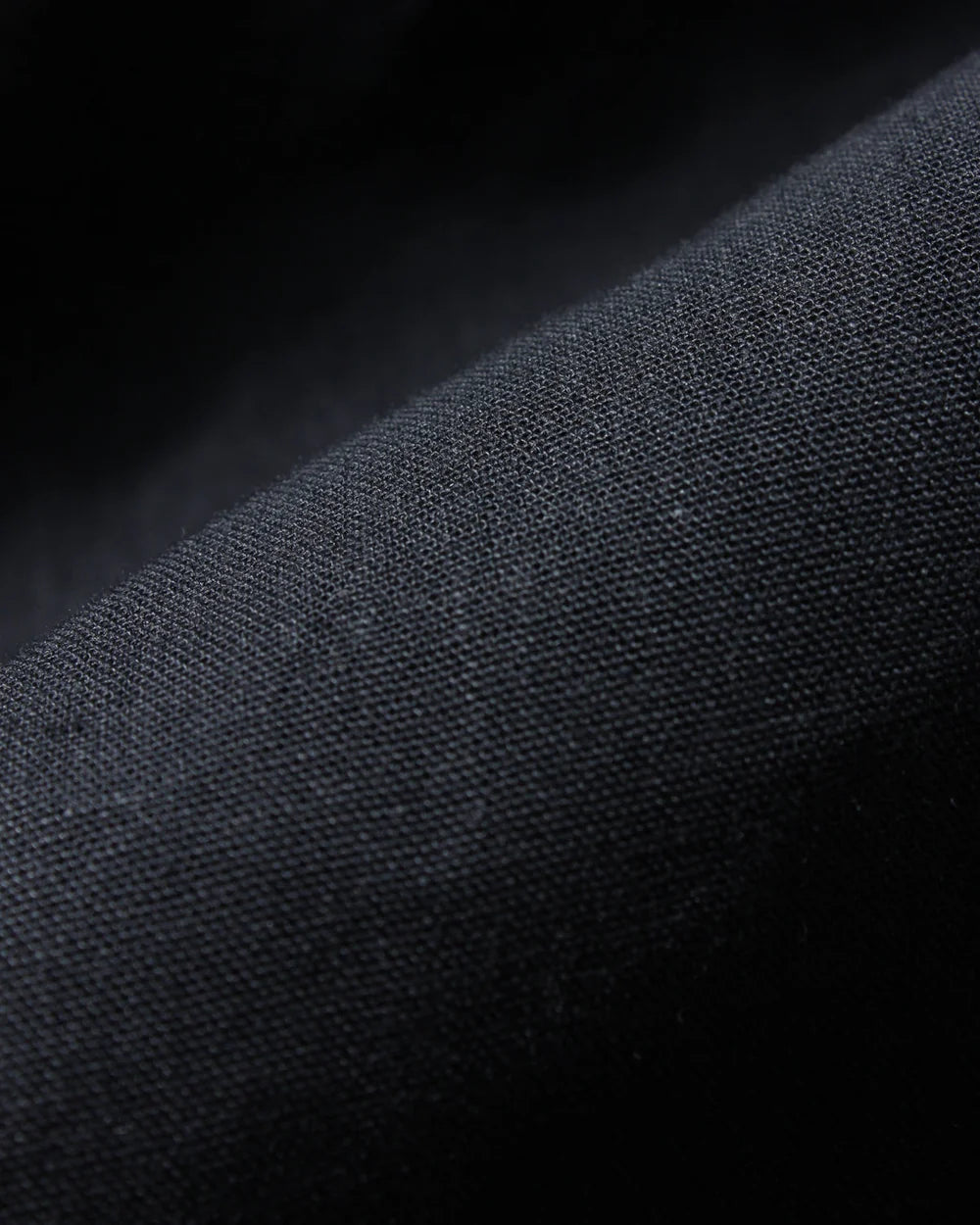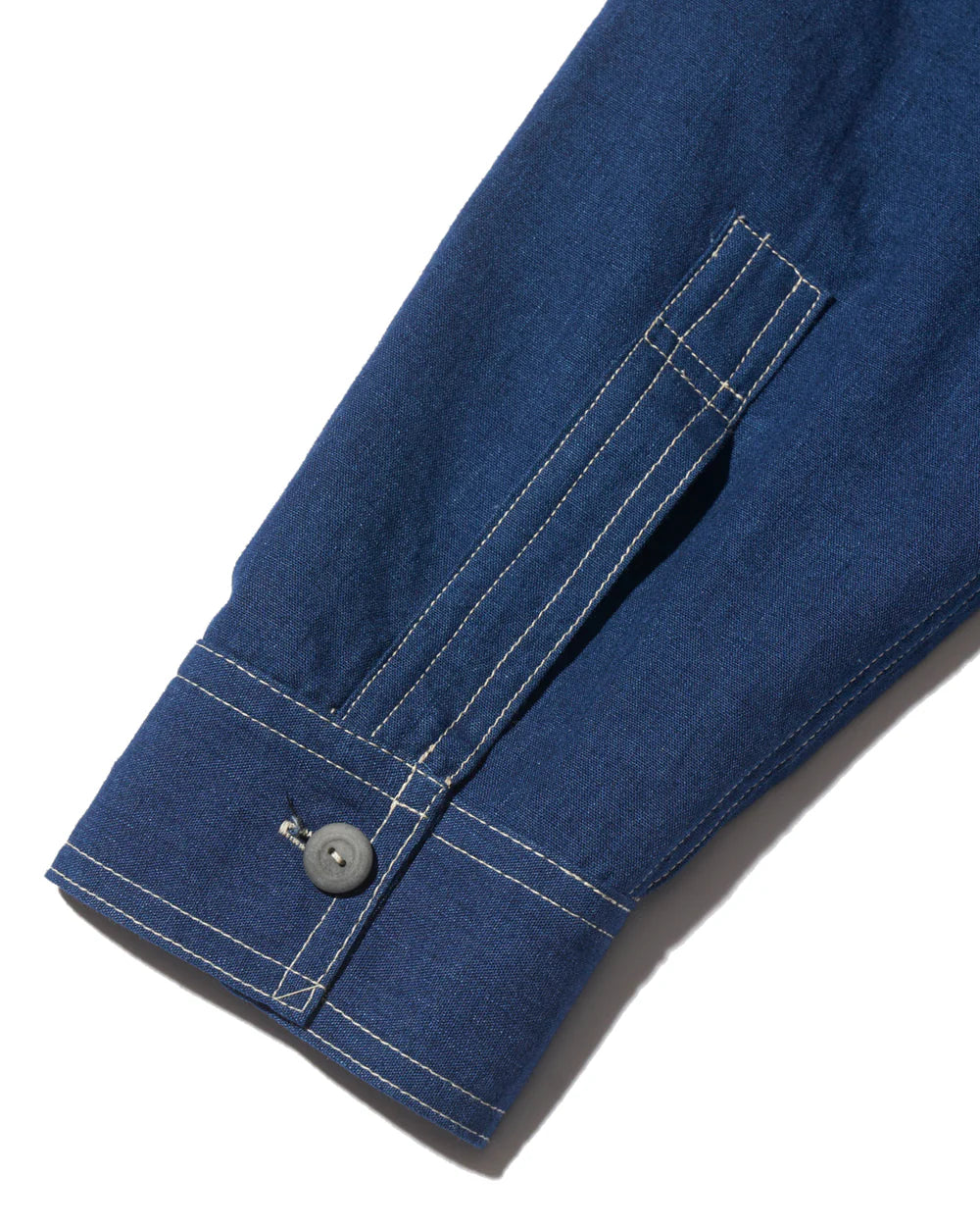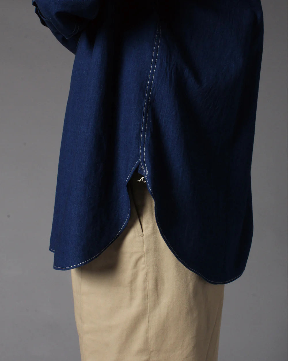 シルエットは、身幅にゆとりを持たせたクラシックなプルオーバー型。頭から被る構造や、広がりのある身頃は、当時の生活や作業環境に根差した設計そのものです。首元には「チンストラップ」を採用し、ボタンで留めることで風や埃の侵入を防ぐディテールを再現。時代背景に即した合理的な意匠が、そのまま息づいています。