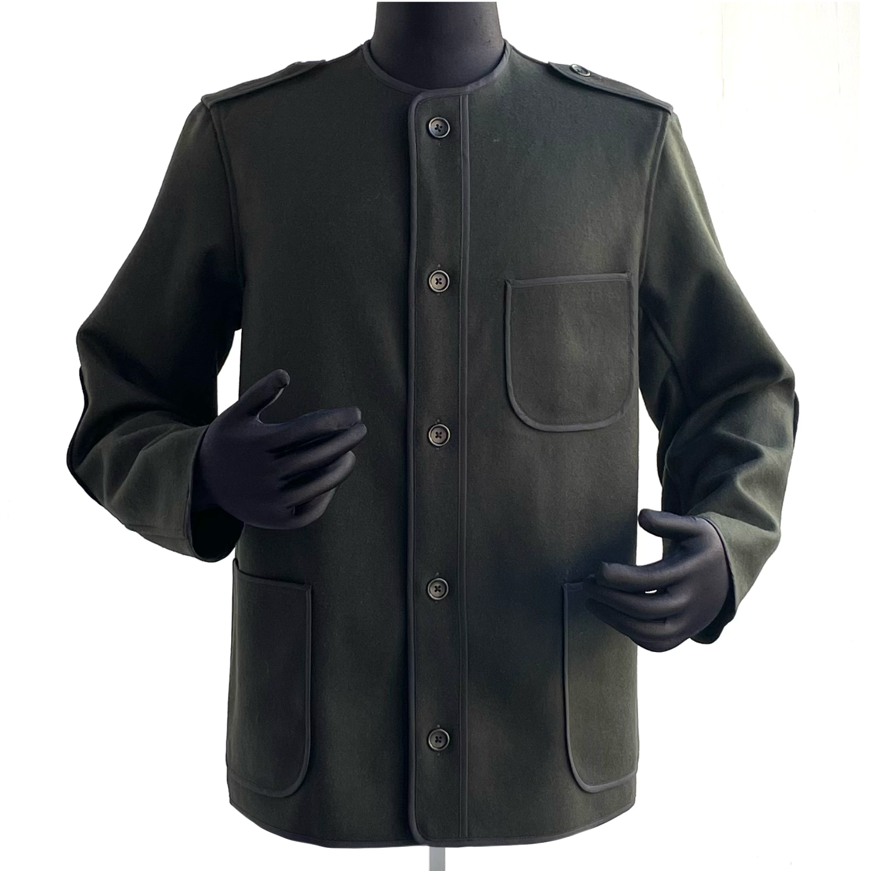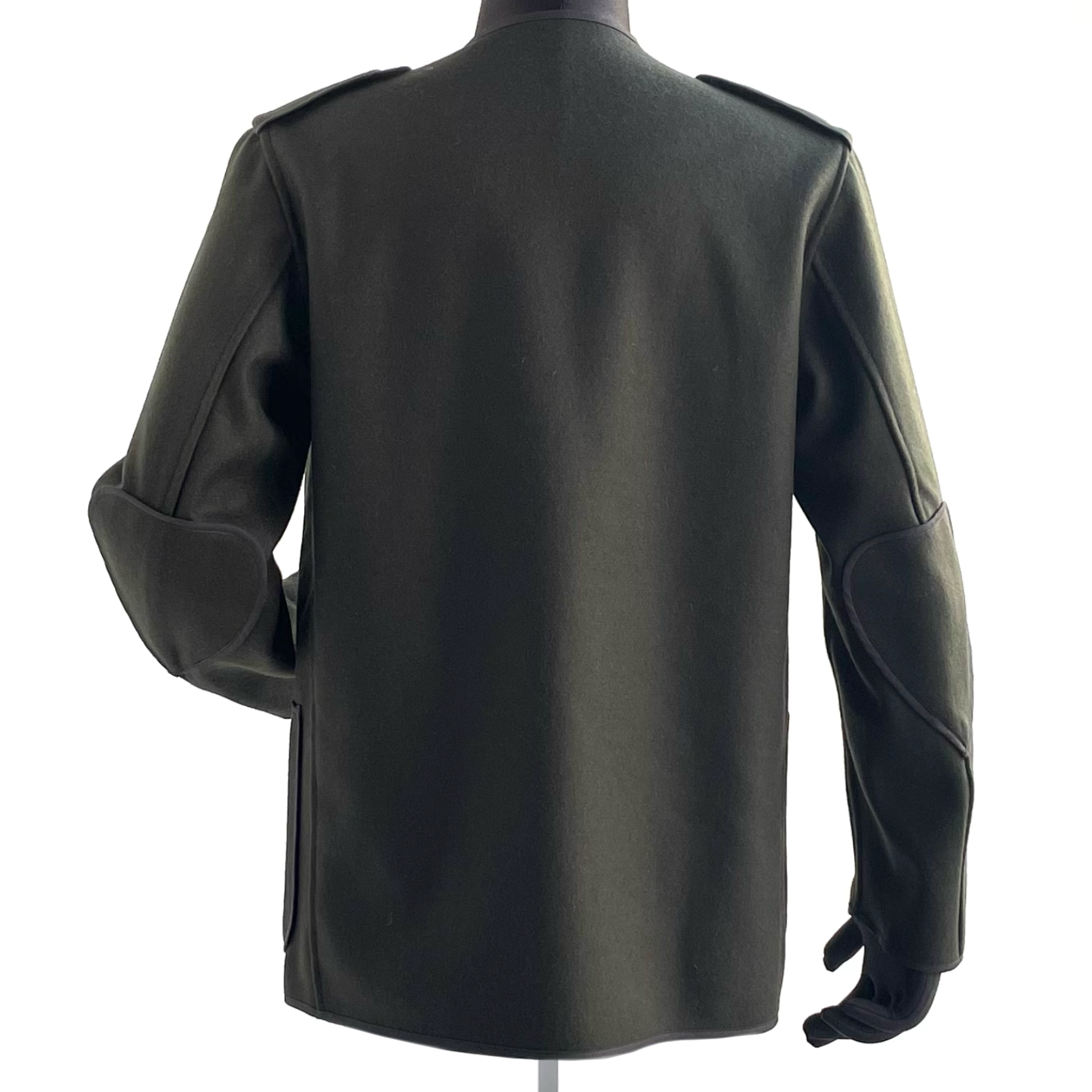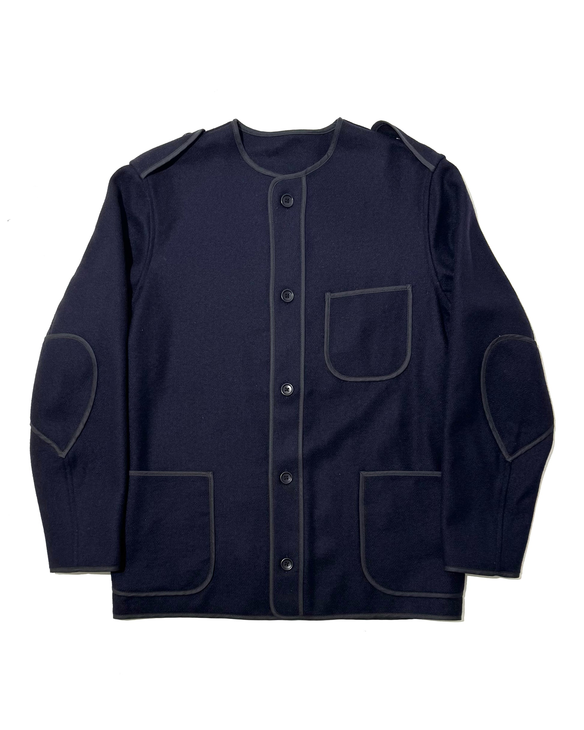 ノーカーラー、エポレット、エルボーパッチが特徴的なジャケット。