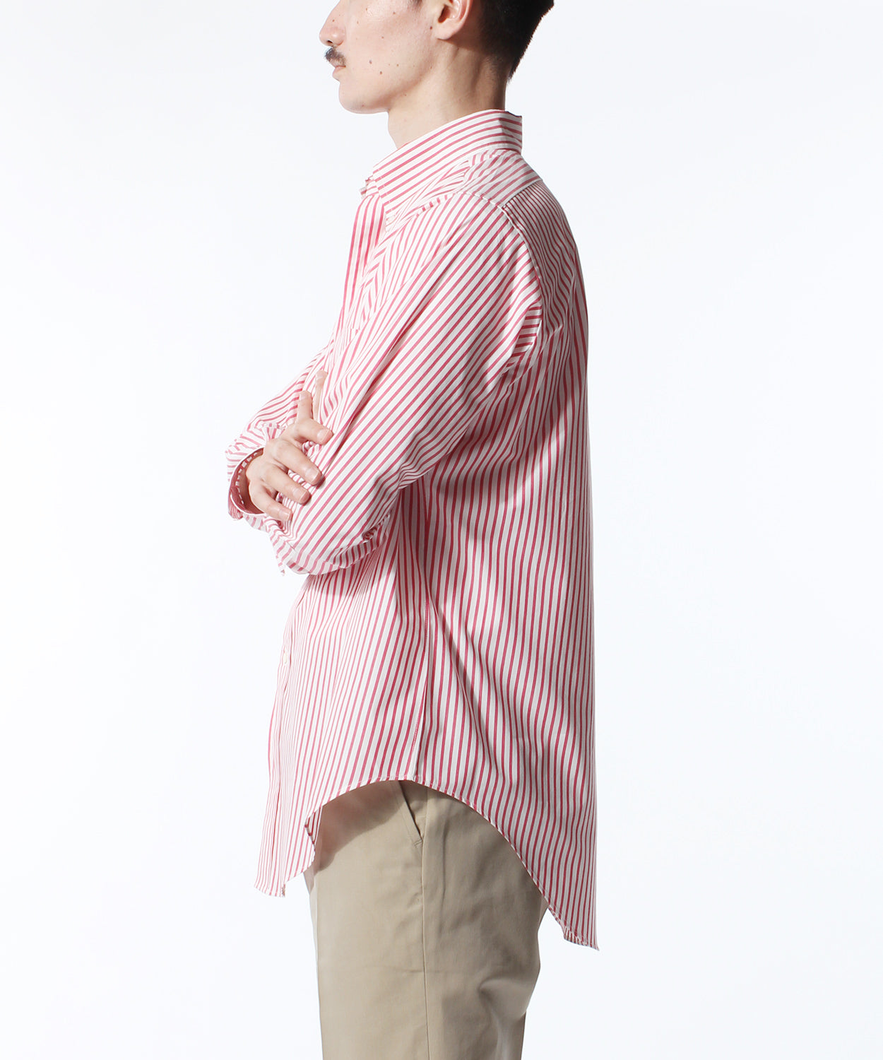 すっきりとした肩周りに対して、ゆとりある身幅やアームホールで、丈が長く、パンツにタックインした際に裾が出にくいデザインです。