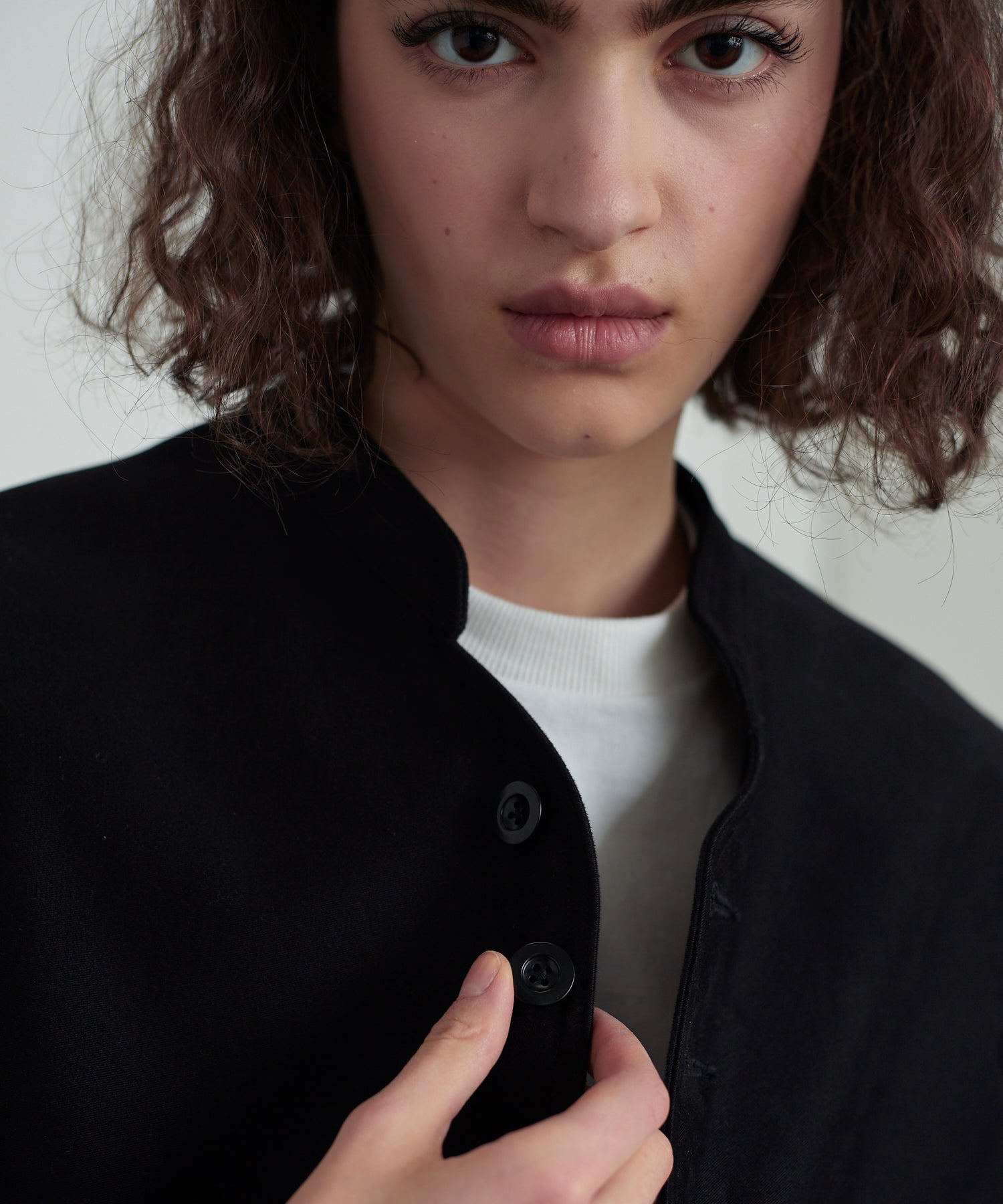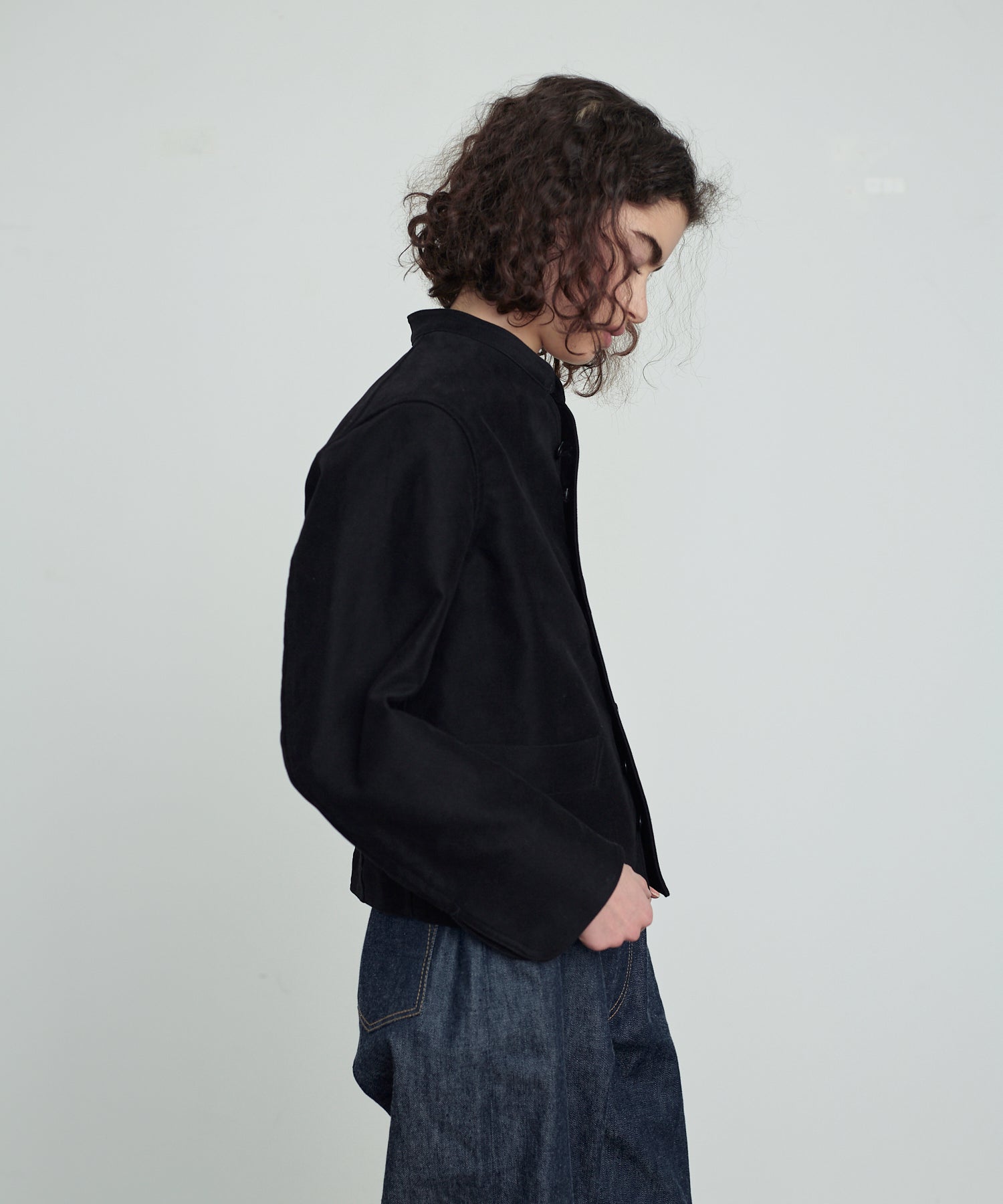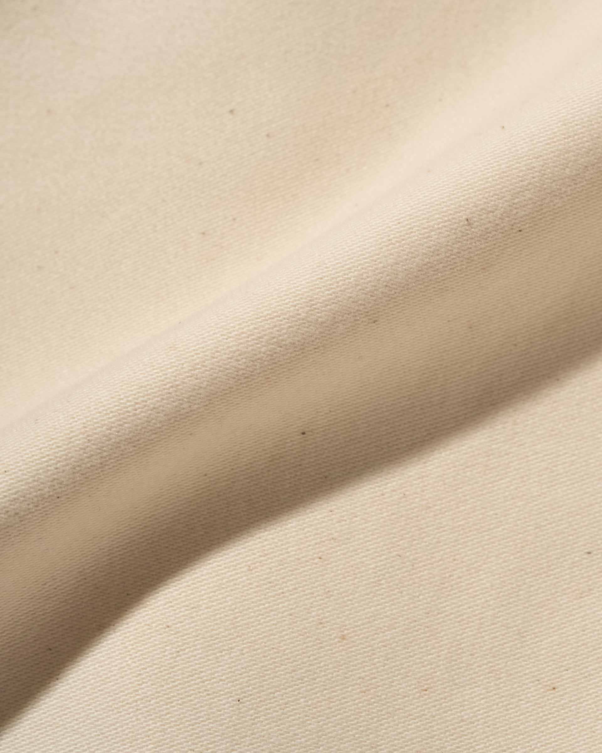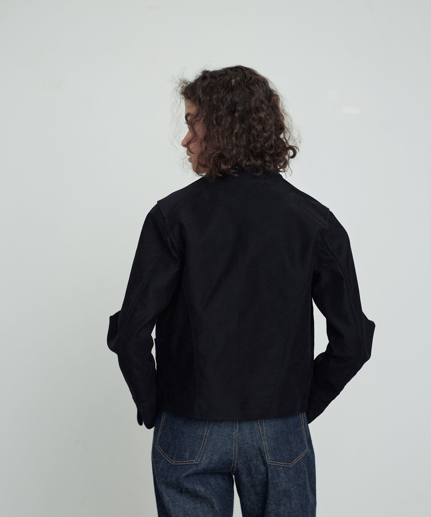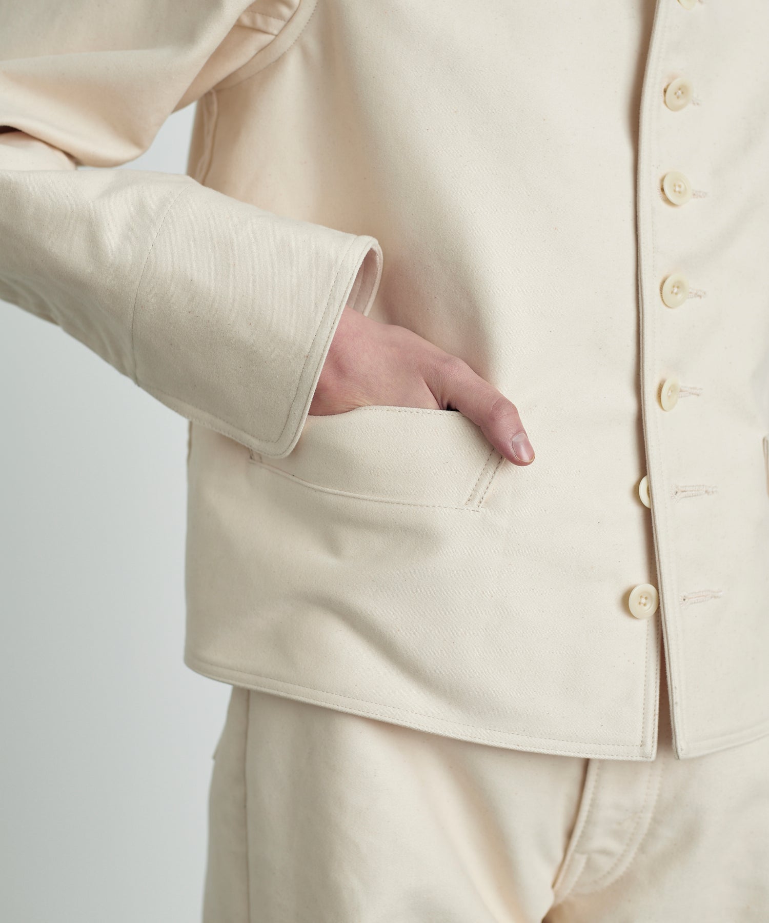 素材には、高密度に織り上げたモールスキンを採用。しっとりとした手触りと鈍い光沢感があり、着用と洗いを重ねるほどに身体に馴染み、味わいが深まります。