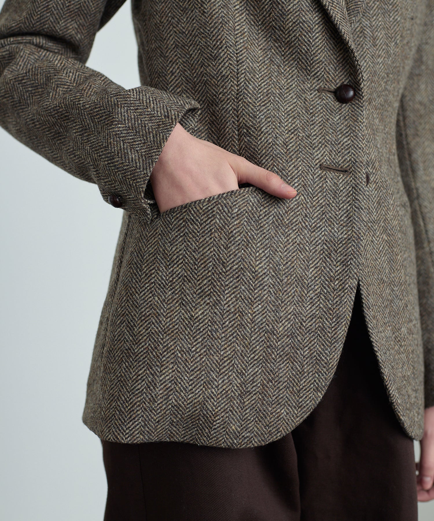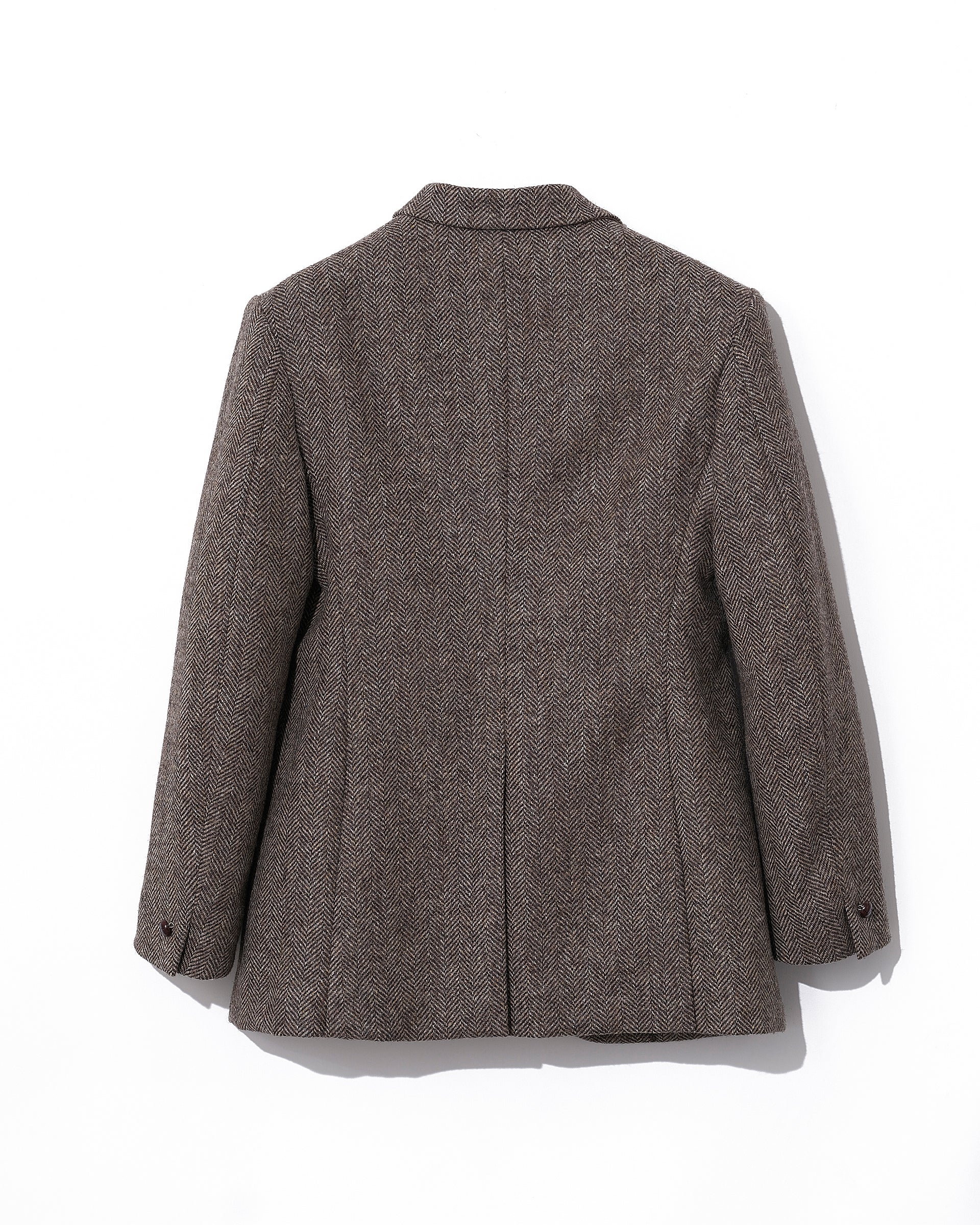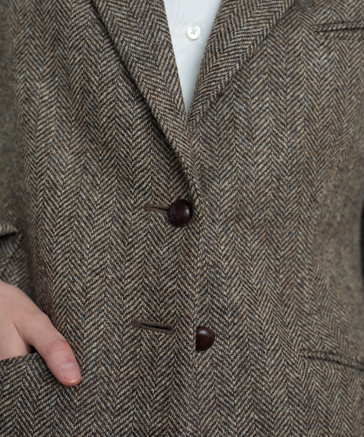 イエローストーンの荒野を生き抜いたジョン・ダットンの妻、イヴリンに着想を得た本作は、タイムレスなヘリンボーンツイードを使用した2ボタン仕様。重厚感のある素材ながら、ウエストにかけての緩やかなシェイプと絶妙な着丈が、しなやかで品のある女性像を引き立てます。