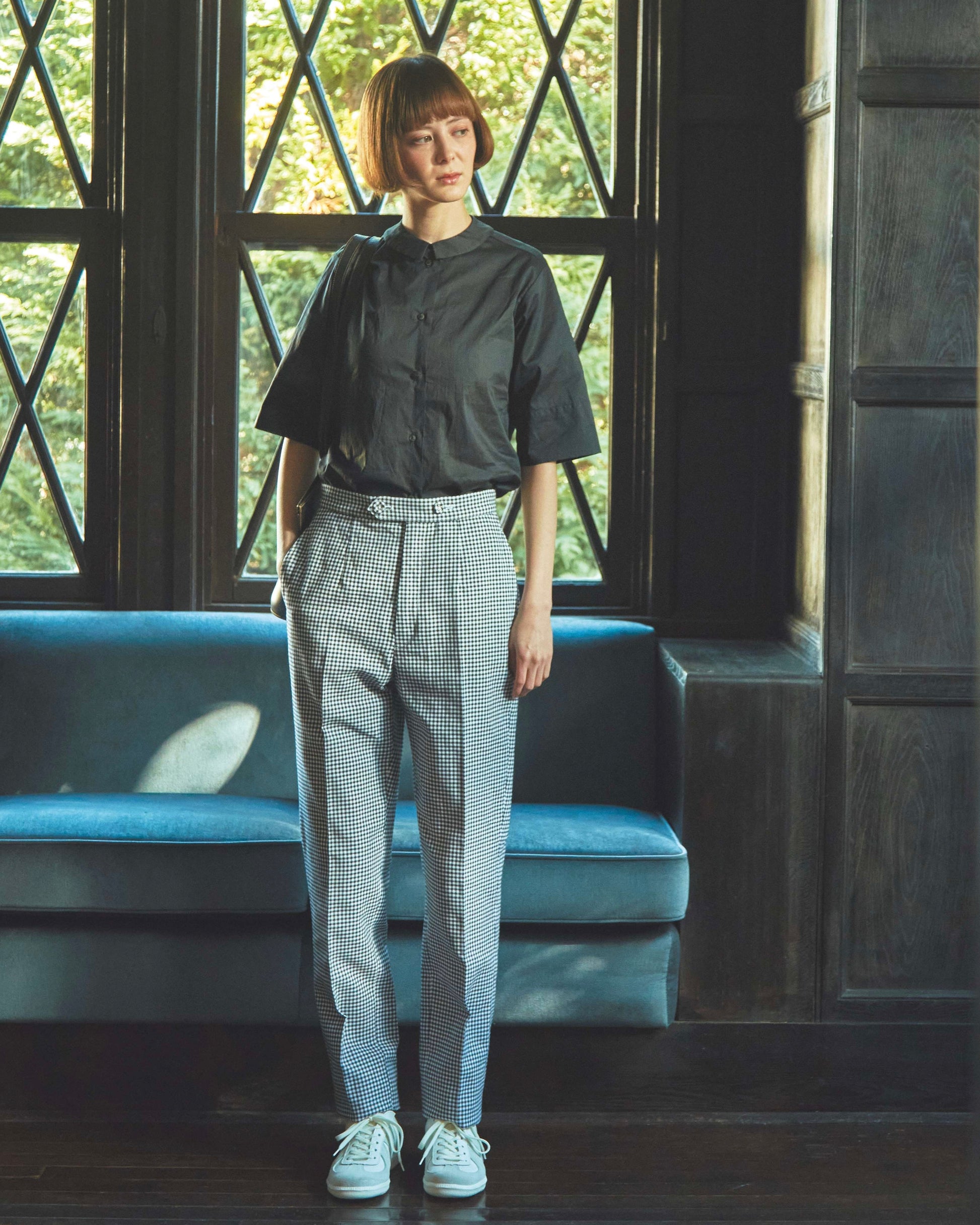ややハイウエストで、裾にかけてのテーパードシルエットが特徴です。