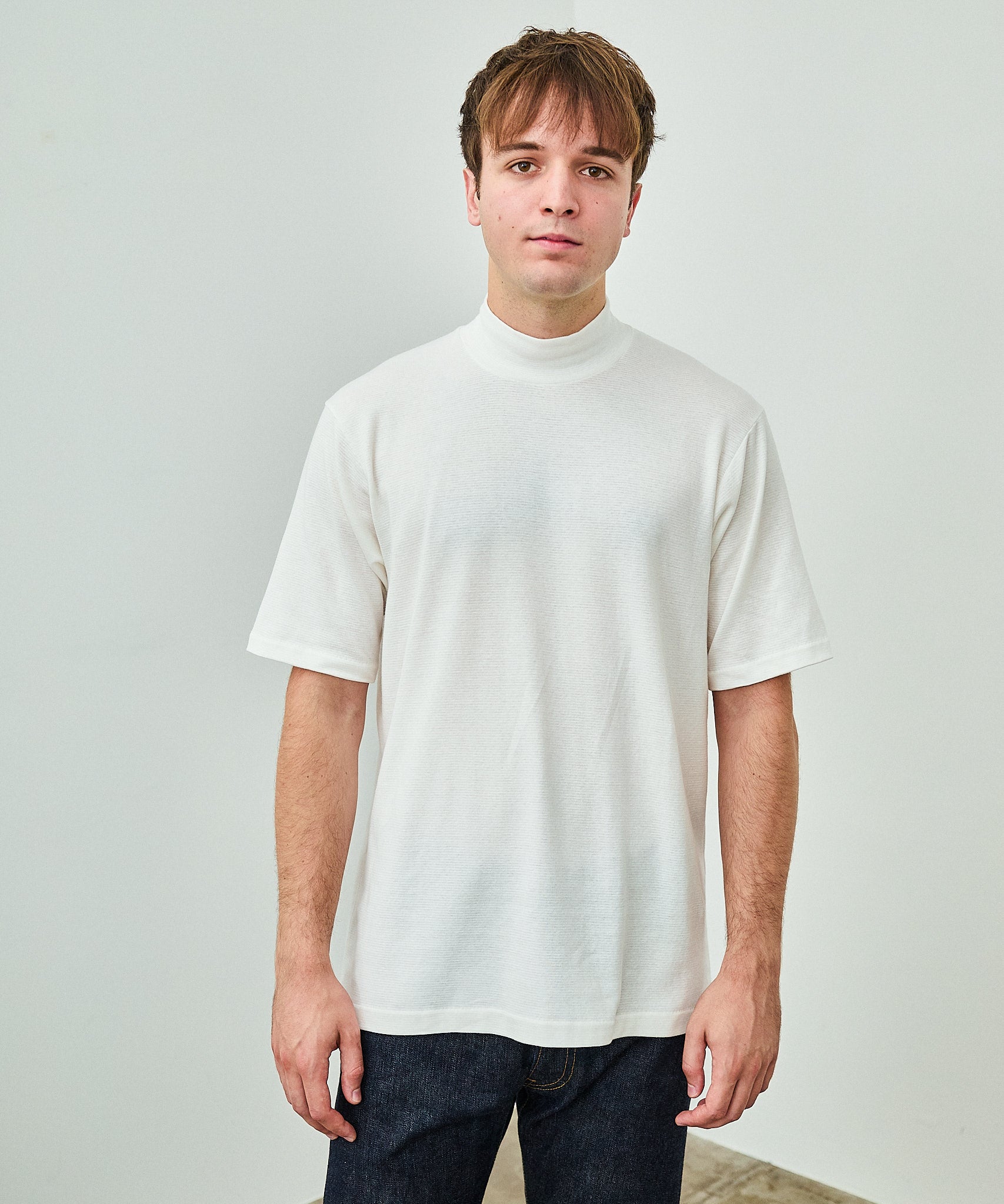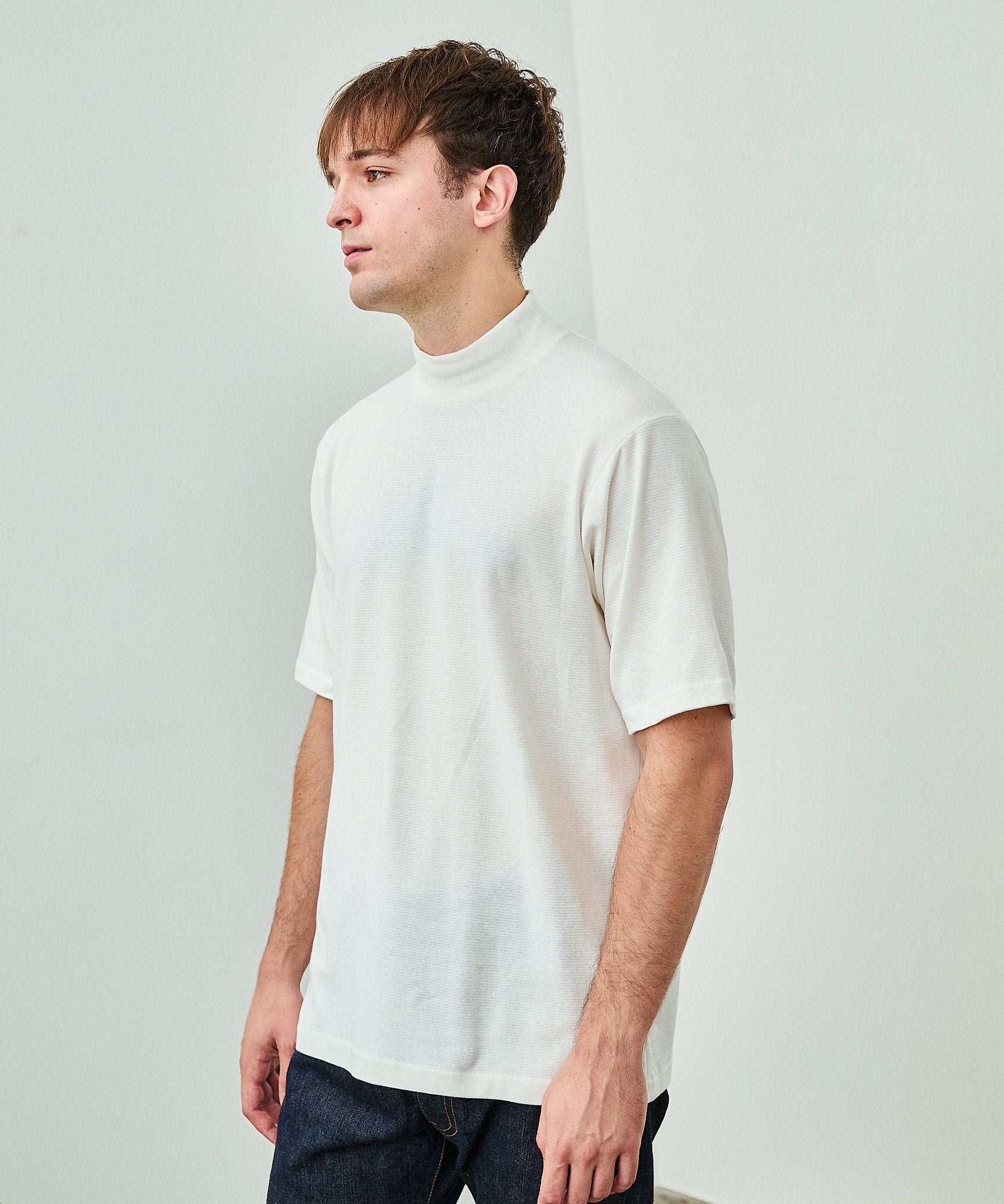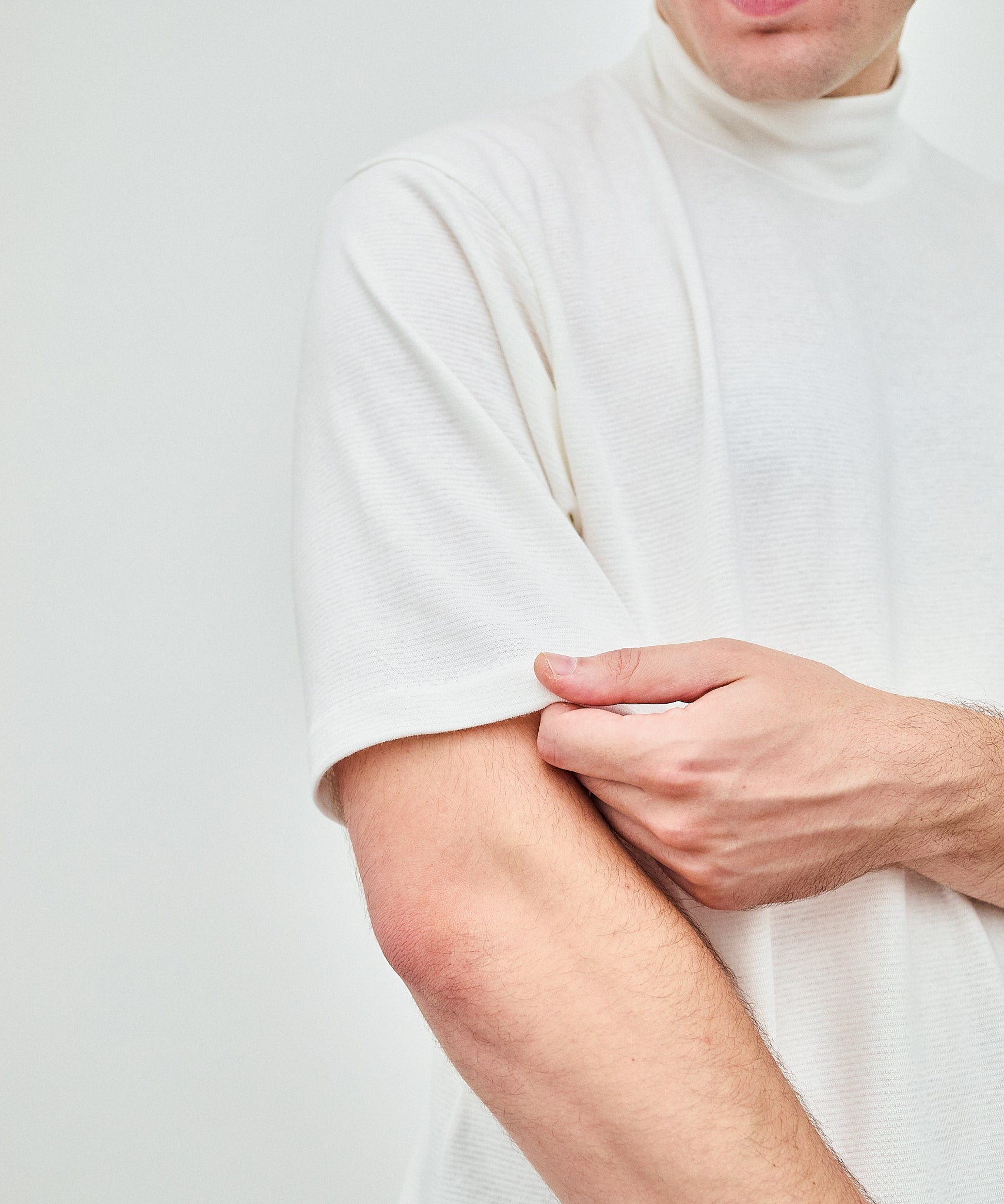 デザイン性ある、程よい長さのモックネックは1枚で着用は勿論、タートルネックのニットの下に着用すると首回りのチクチクを回避したりなど、デザイン面でもデイリーで万能なアイテムです。