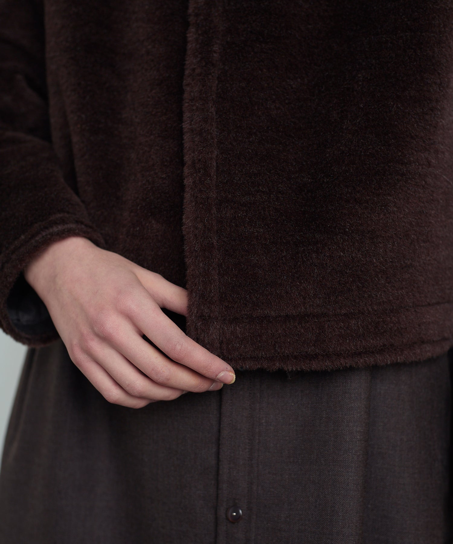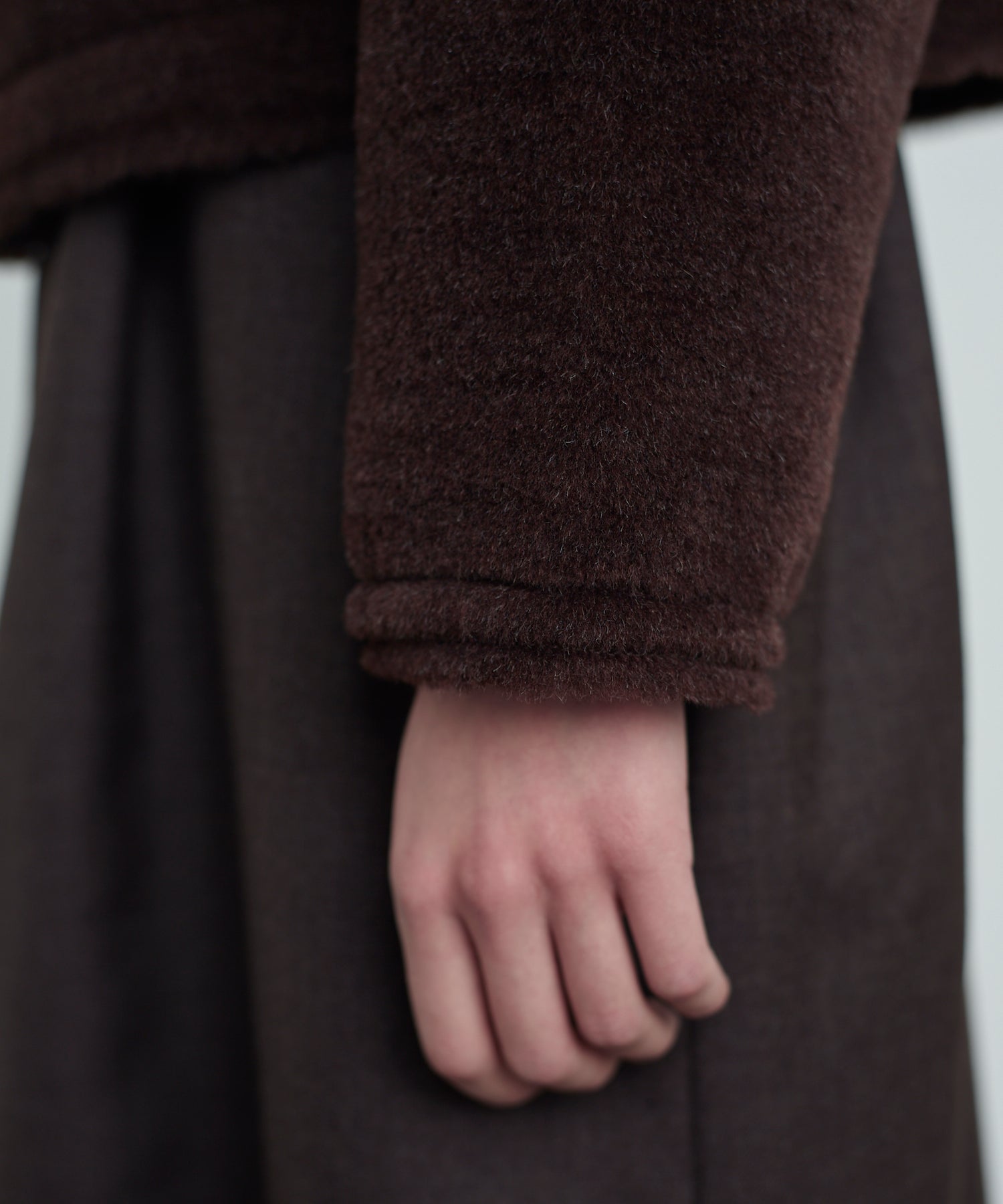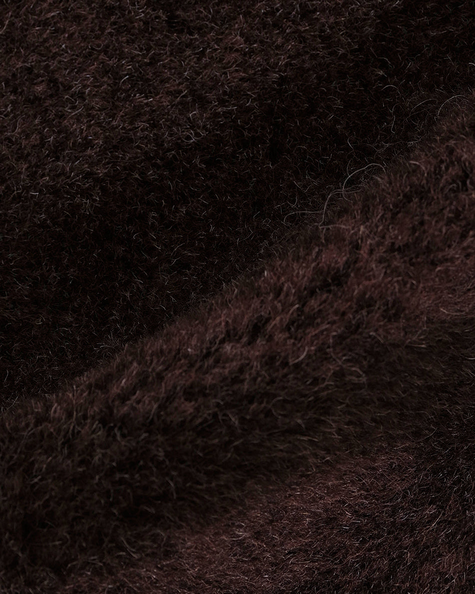 素材には、ナチュラルな毛足と深みのある表情が魅力のアルパカ混ファーを使用。無骨さの中にも温かみを感じさせる風合いが特徴です。