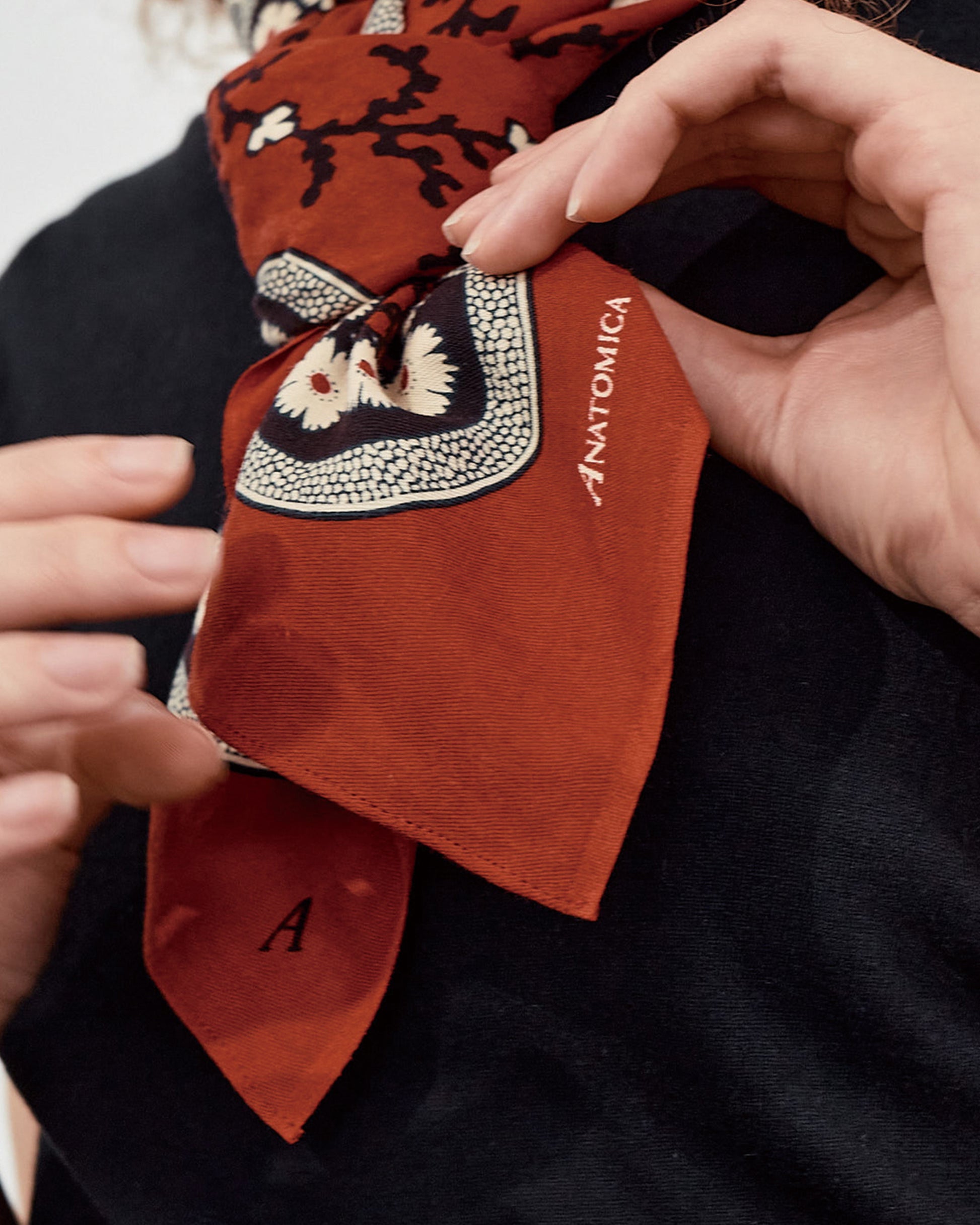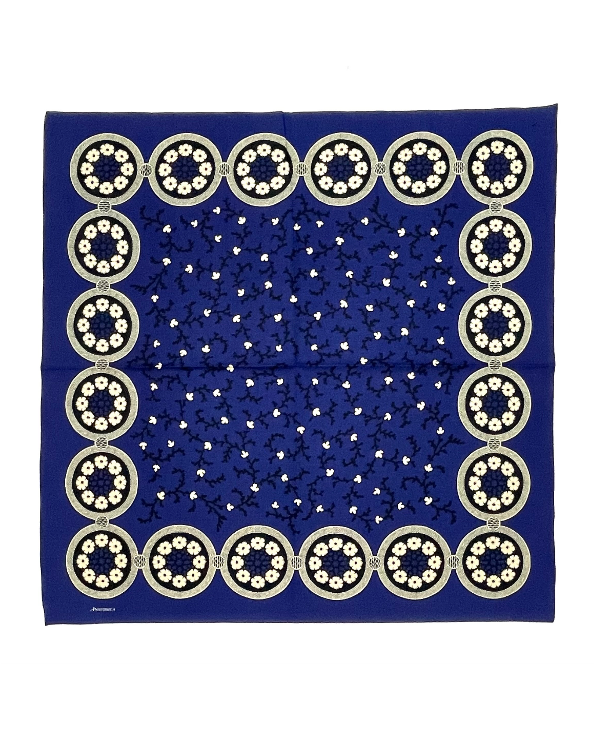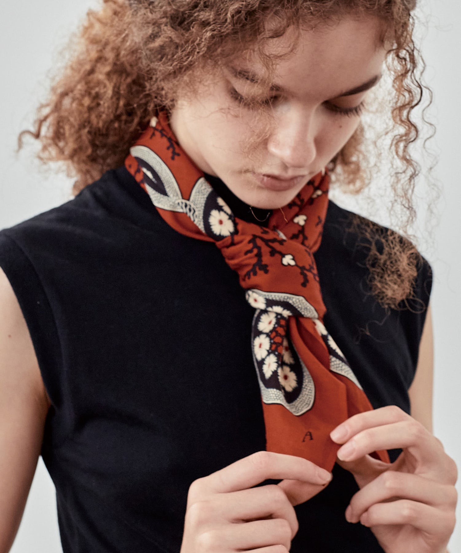 ヨーロッパのヴィンテージのスカーフがデザインソースになった、花柄のサテンスカーフ。