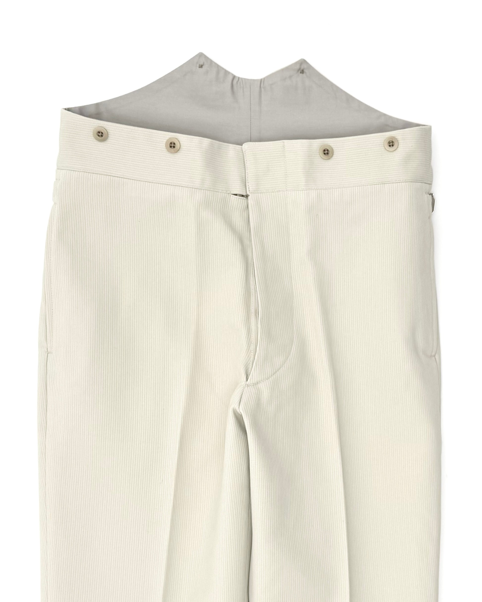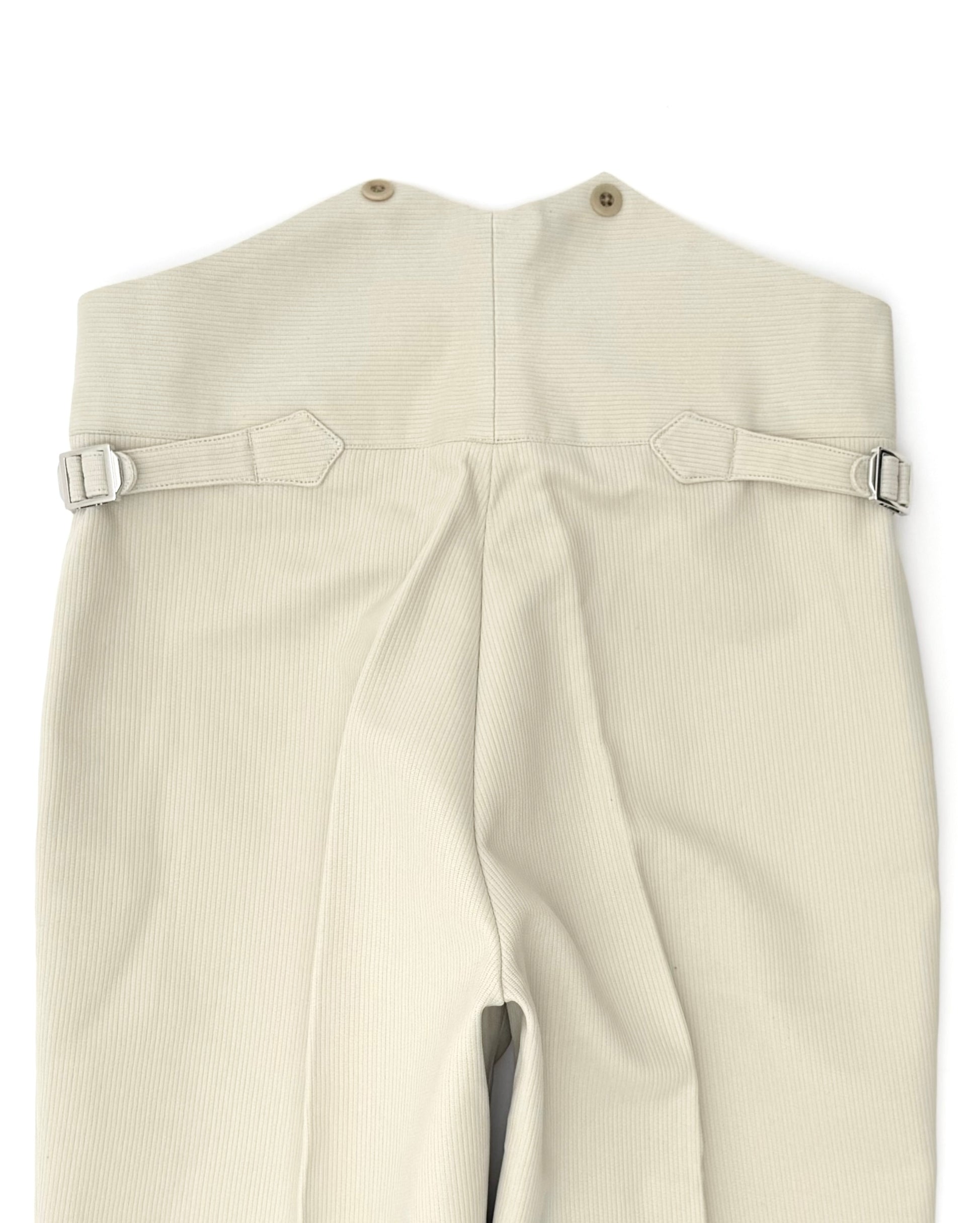 特徴的なハイバックに、サイドアジャスター仕様、サスペンダーボタンも施されており、サスペンダーにて着用も可能。