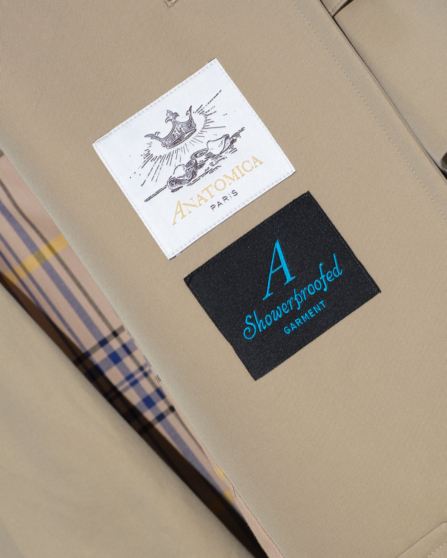 生地は、ANATOMICA独自の「高密度織ギャバジン」。かなり密に織られているが故に、綿でありながらシャワープルーフ(強力な撥水)。