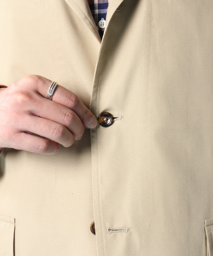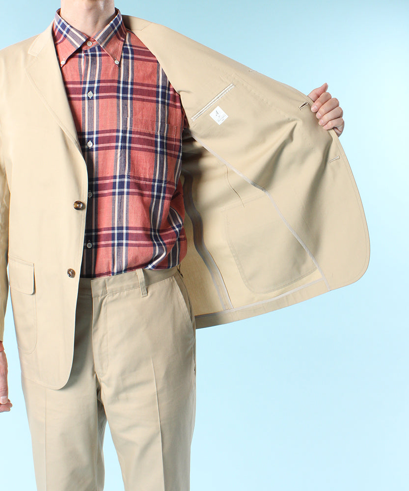 3つボタン、ナチュラルショルダー、細めのラペルのクラシックな扱いやすい形。