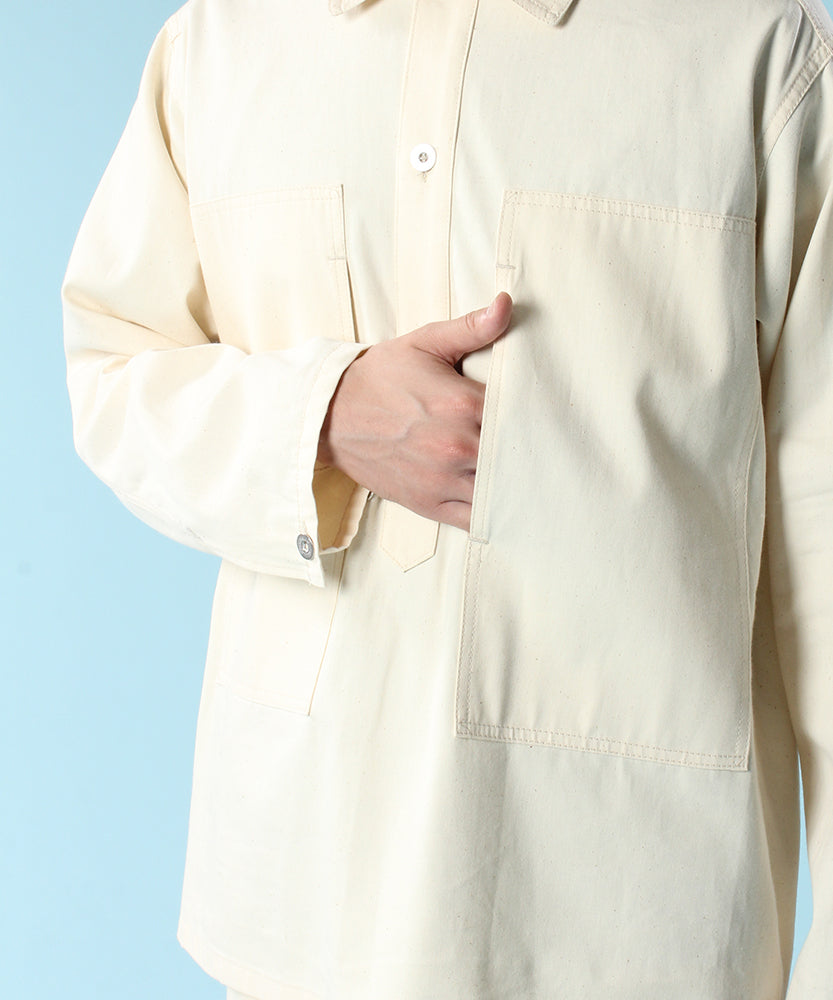 プルオーバー型で両胸に大きなポケットの付く特徴的なデザインです。