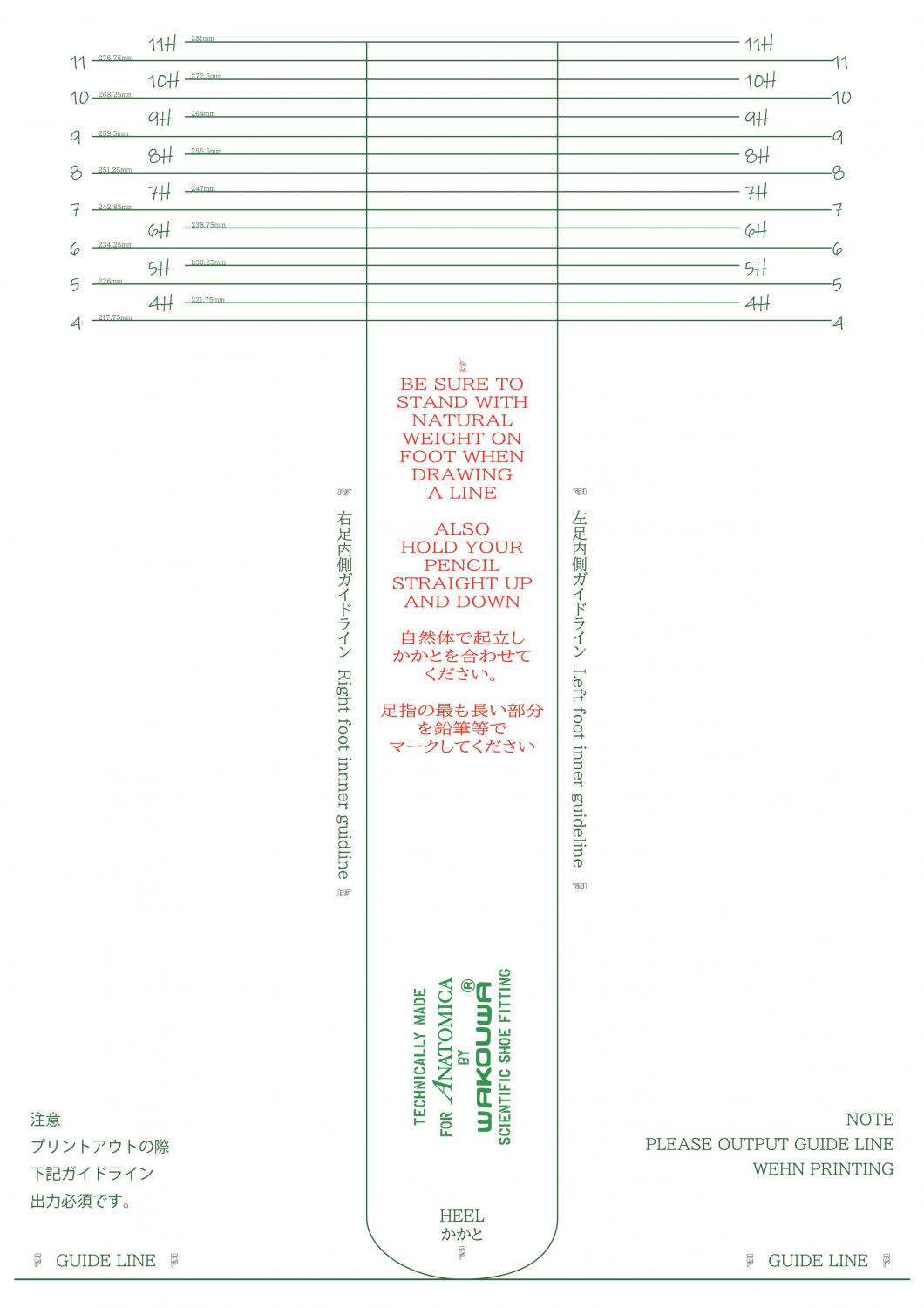 4、 「guide line」にかかとを合わせ、左足であれば左足の内側を縦の「guide line」に沿わせます。この際に足を揃えて自然体で真下を見て下さい。足の一番長いところが指し示している箇所にペンで印を付けてください。(足の指を傷つけないようにご注意ください。)そこがお客様の足長となります。前かがみになりすぎたり、逆に後ろに体重がのっていると間違ったサイズを選んでしまう恐れがあります。