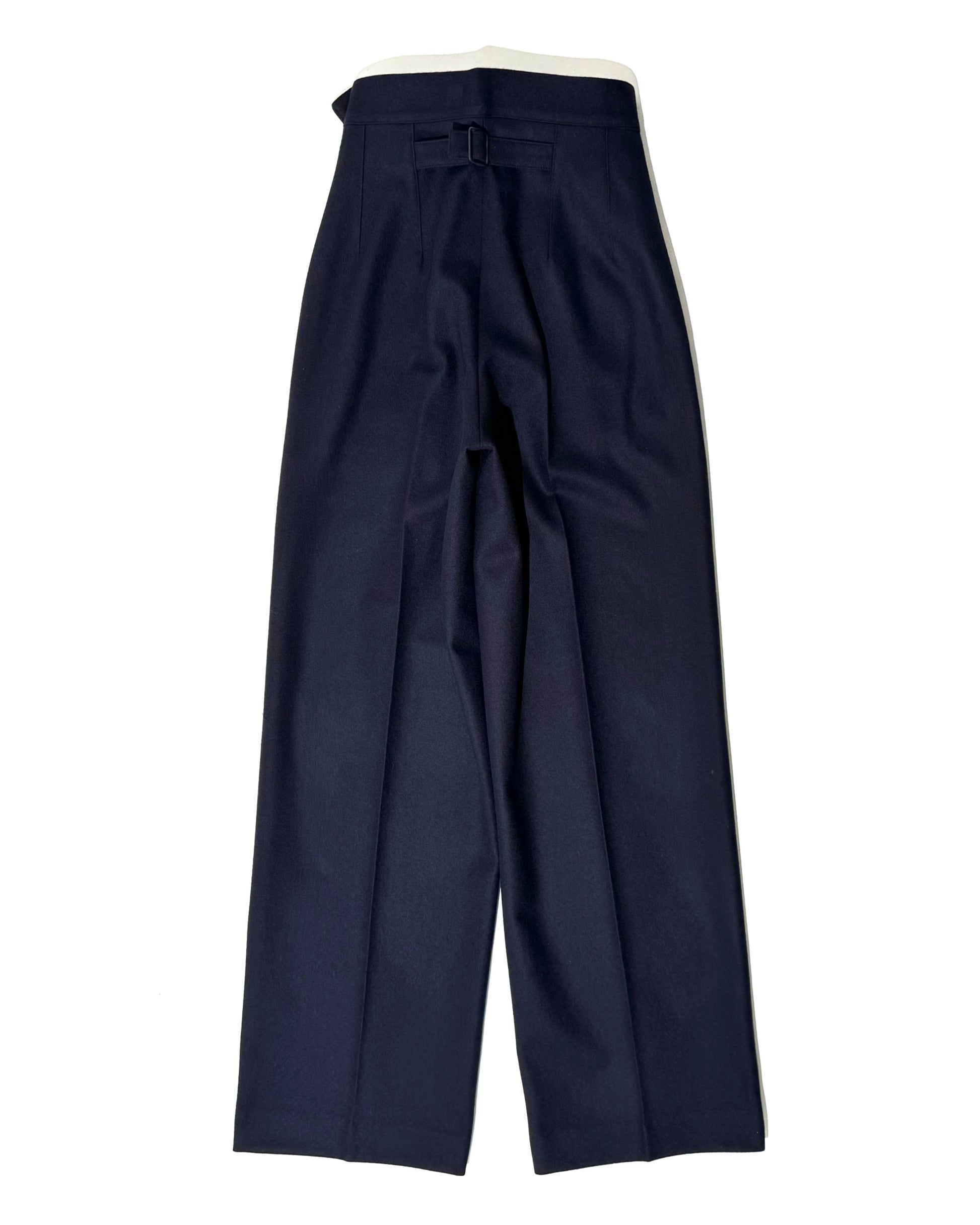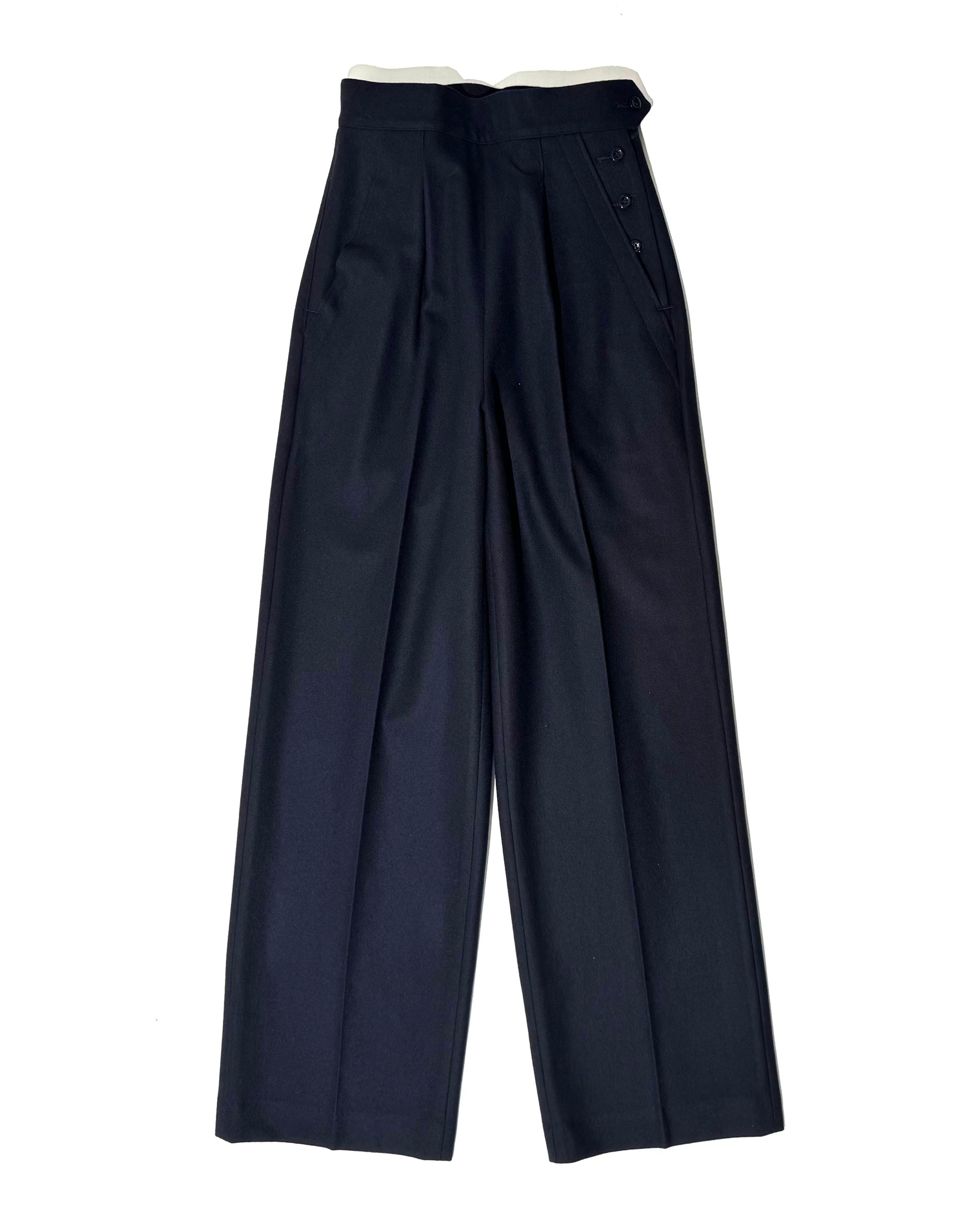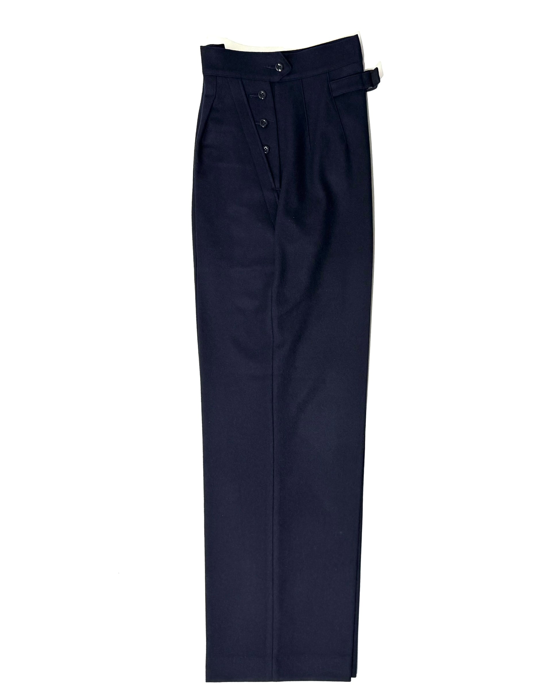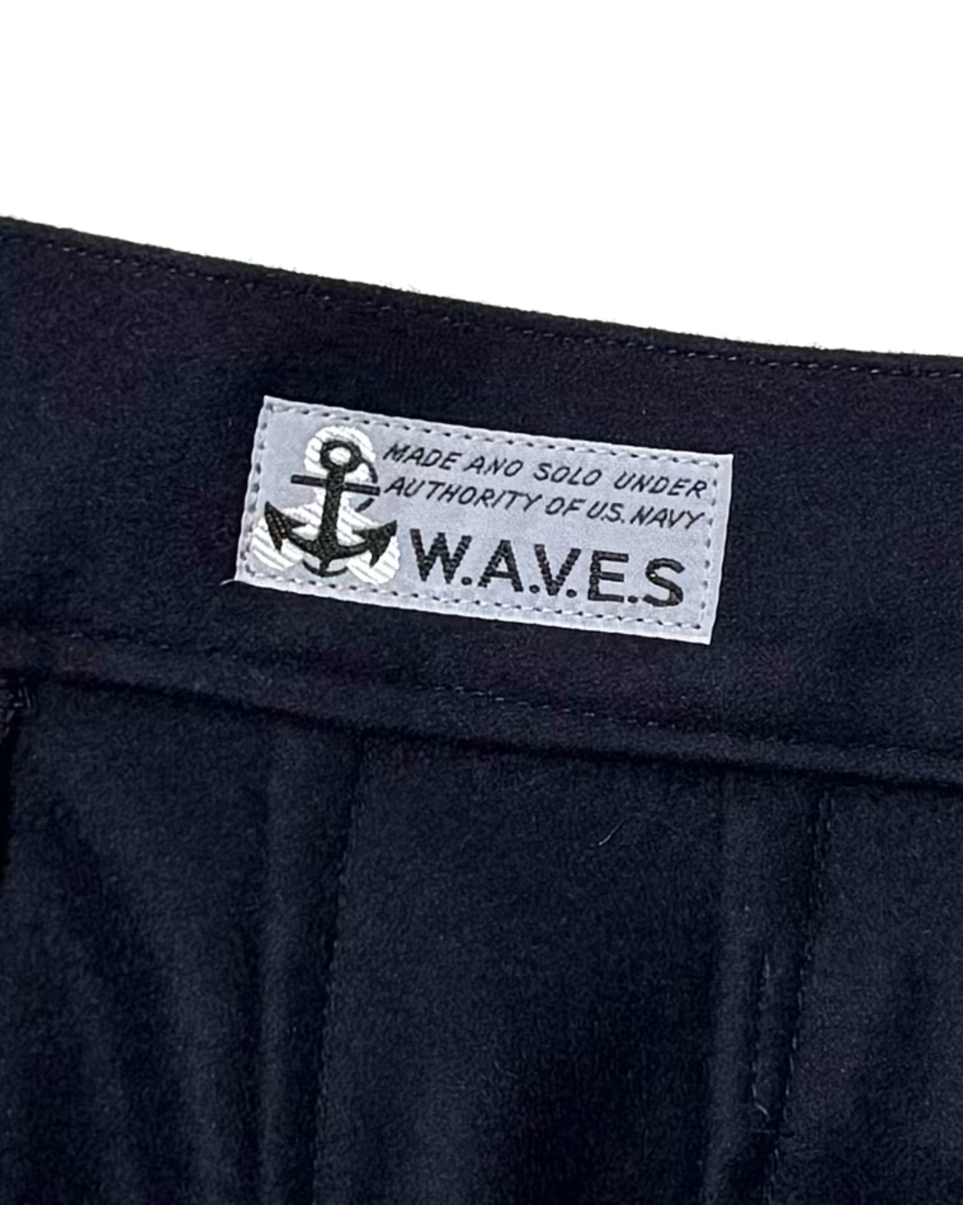 第二次大戦時にアメリカ海軍予備軍の女性部門であるW.A.V.E.S (Women Accepted for Volunteer Emergency Service)のダンガリーパンツがモチーフ。屋外での労働の際に実用的な男性用のダンガリーパンツを参考に作られた女性用のパンツです。