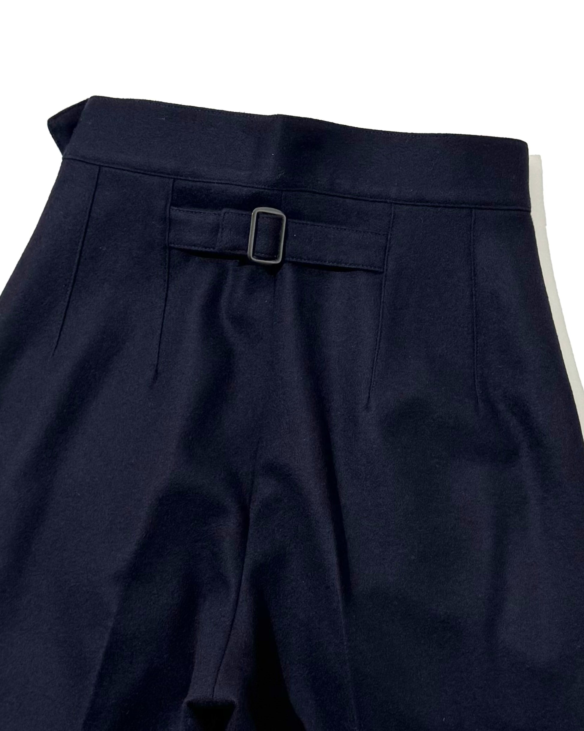 股上が深く太めのストレートで、丸みのある女性の体型にフィットするようにとられたフロントのタックと背面のダーツが特徴です。